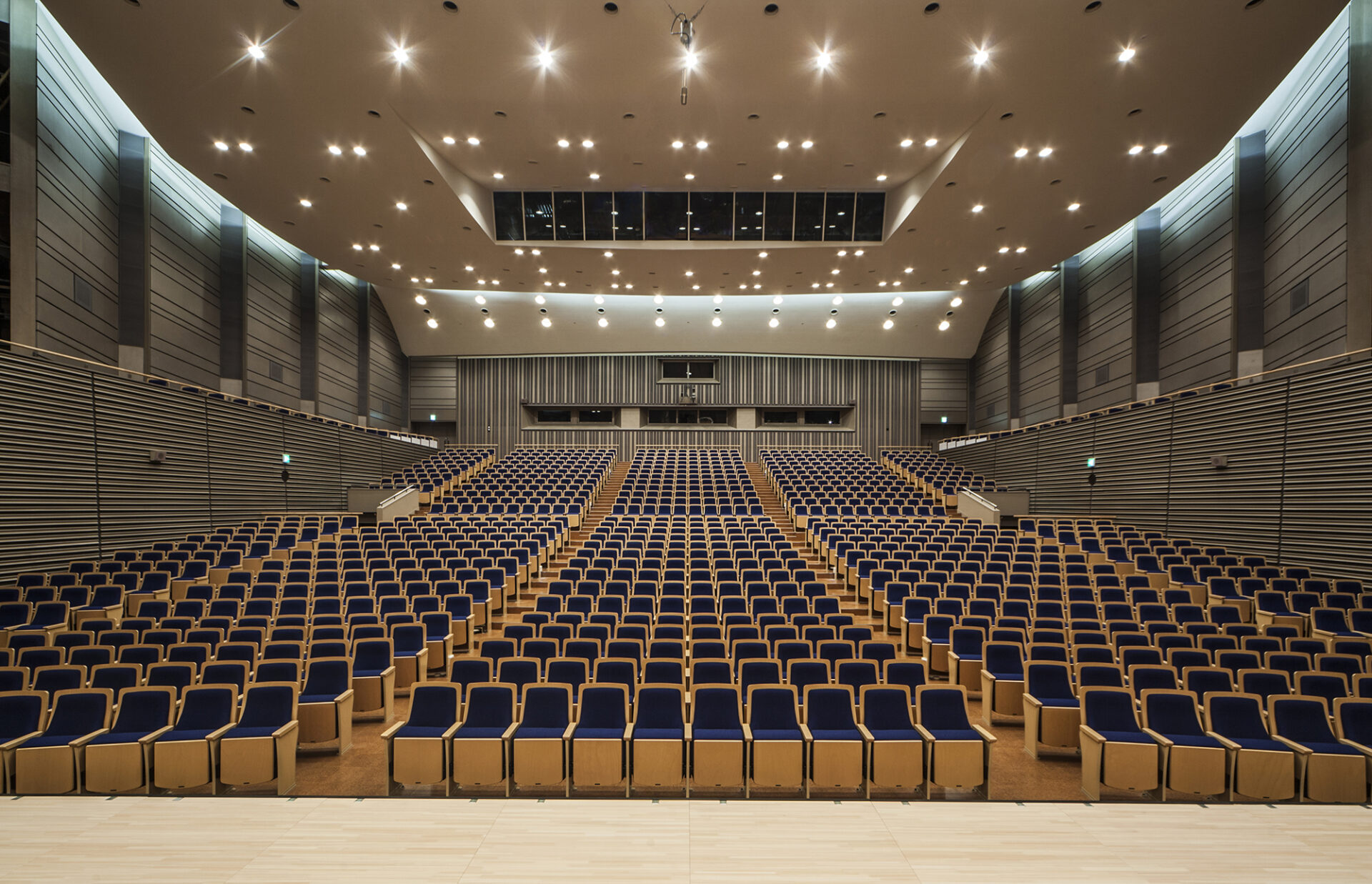 地球環境に配慮し、使用できるものは活用すること、県産材や県内企業の技術を随所に取り入れることを基本コンセプトとしています。新設の車寄せキャノピーには、新幹線のフロントガラスを作る技術が3次元の曲面ガラスに活かされています。新設の公共用歩廊のガラスの防風スクリーンには、富山の高度なガラス加工技術を駆使しています。また、城址公園や松川側に開けたオープンスペースを整備し、テナントエリアを交差点角まで拡張することで開放的なつくりをしました。会議室棟の耐震改修では、建設地は地下水位が高く、基礎免振を採用した場合、地下水の排水処理が困難となるため、既存の地下外壁を有効に活用できる“免振レトロフィット工法”による中間階免振を選択しました。基本的には柱頭免振ですが、EVコア廻りは柱脚免振です。会議室棟とホール棟の躯体間は、免振クリアランスを確保するために、ホール棟側7通の柱を移設し、1階以上については7通の構造フレームを全て撤去しています。また、免振化による応力の増加、免振支承設置のため、地下柱と1階床梁および基礎梁を増し打ち補強しています。
